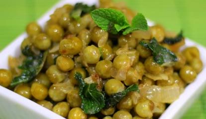 Picar la cebolla muy fina y pochar en una sartén a fuego lento. Añadir los guisantes cuando la cebolla esté transparente y añadir las hojas de menta cortadas en trozos con la mano para que den más sabor. Rehogar todo junto un par de minutos. Añadir el caldo y dejar cocer unos 5 minutos hasta que el caldo se haya consumido. Añadir la pimienta blanca y la sal, dar un par de vueltas y retirar del fuego.